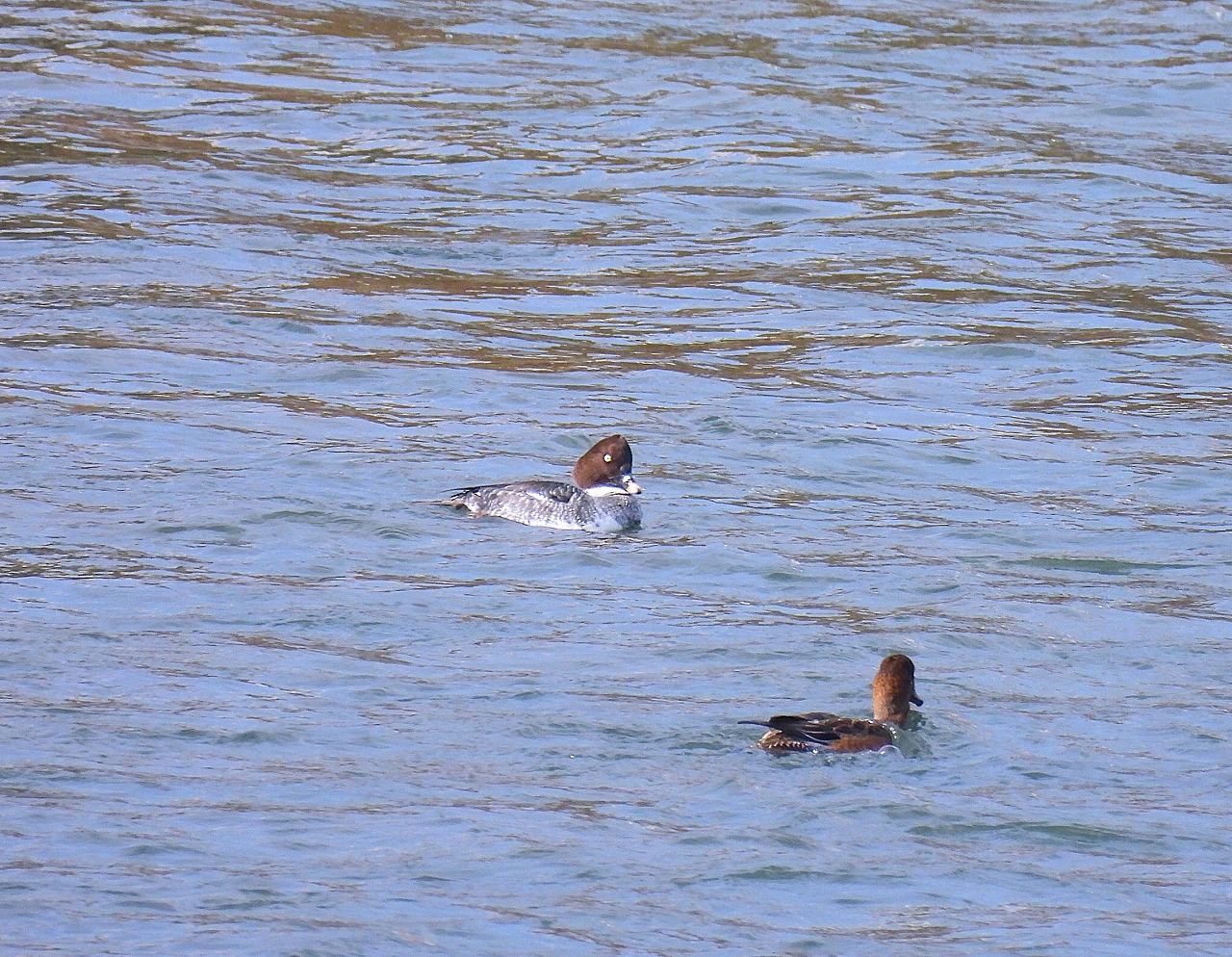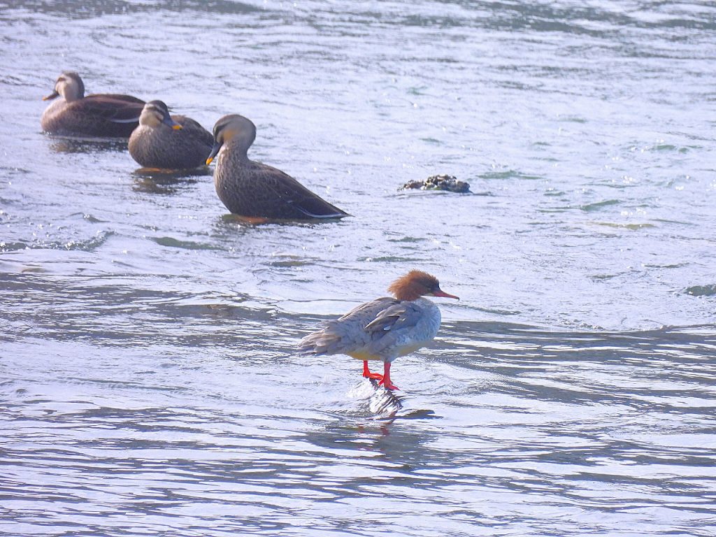 良い天気に恵まれ気持ちよく洗堰周辺を歩いて回ることができました。上流にはホシハジロやキンクロハジロなどの海ガモやカンムリカイツブリが見られました。下流に行くとヒドリガモやカルガモ、オカヨシガモなど草食のカモたちが揃い踏み。また、ホオジロガモも今年もまた来ていました。サギたちやイソシギ、カワウなどもスコープでじっくり観察することができました。