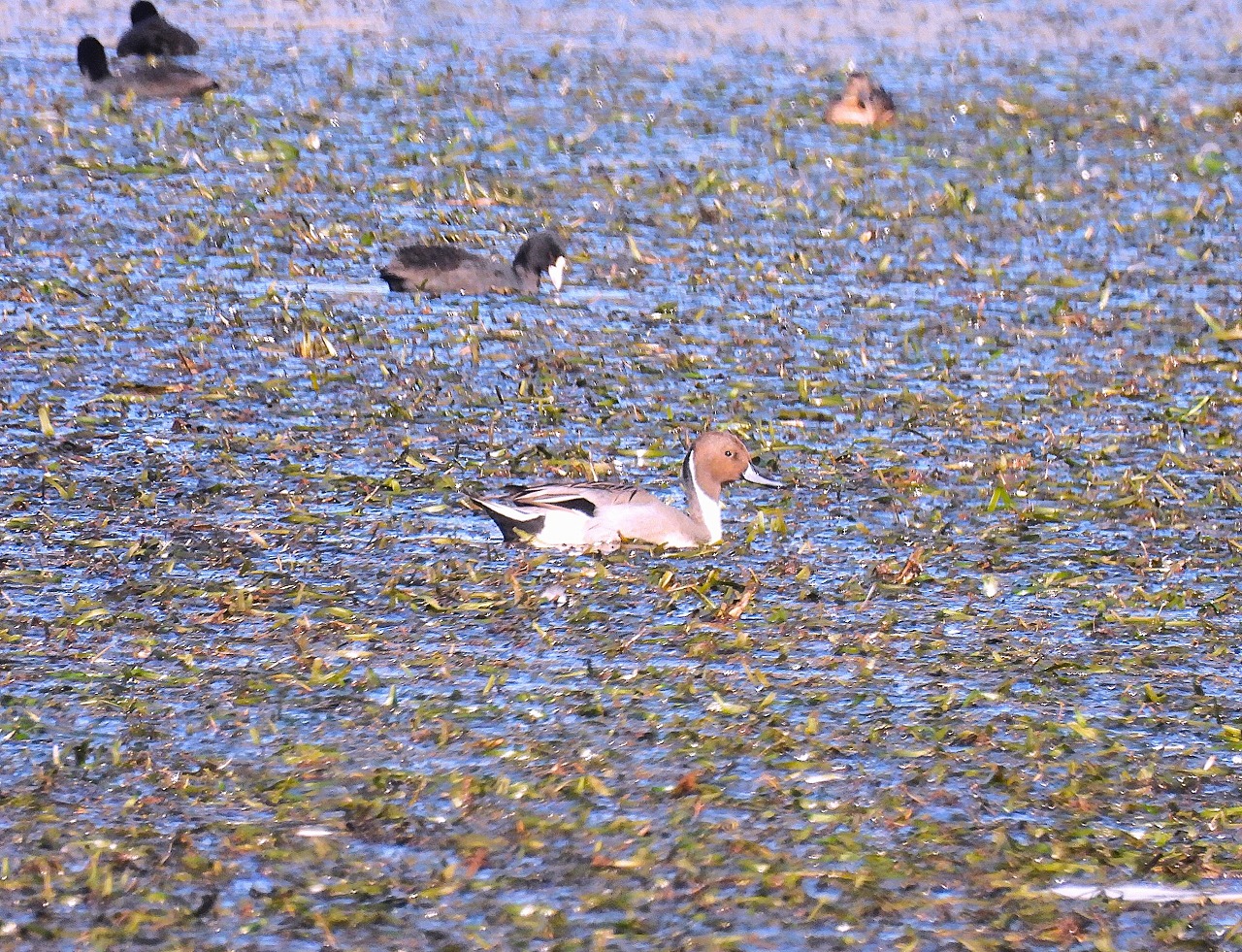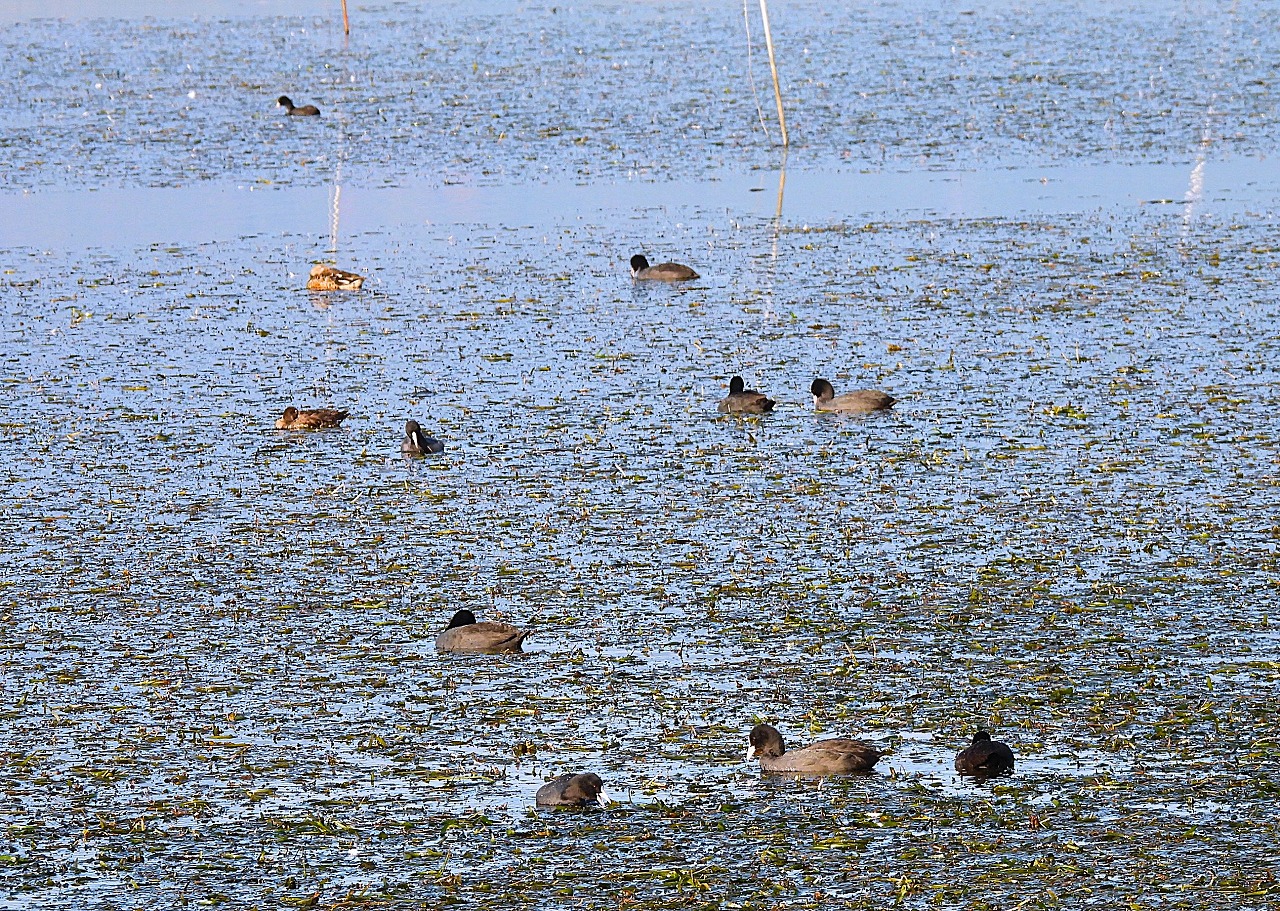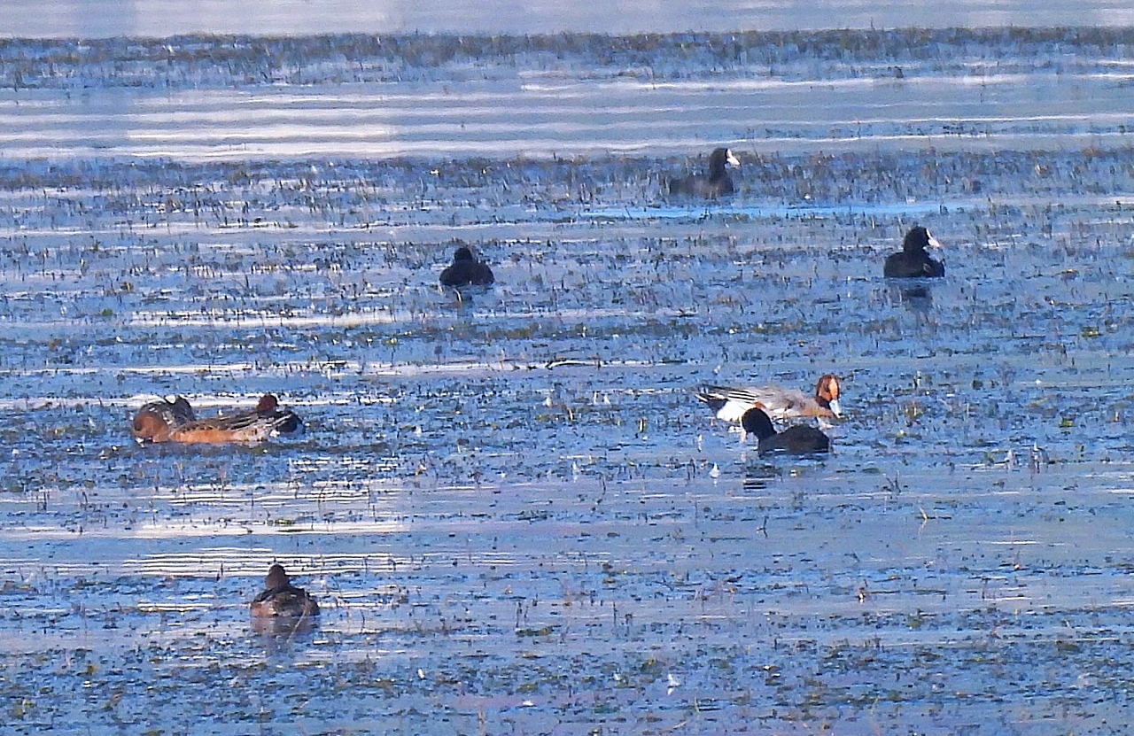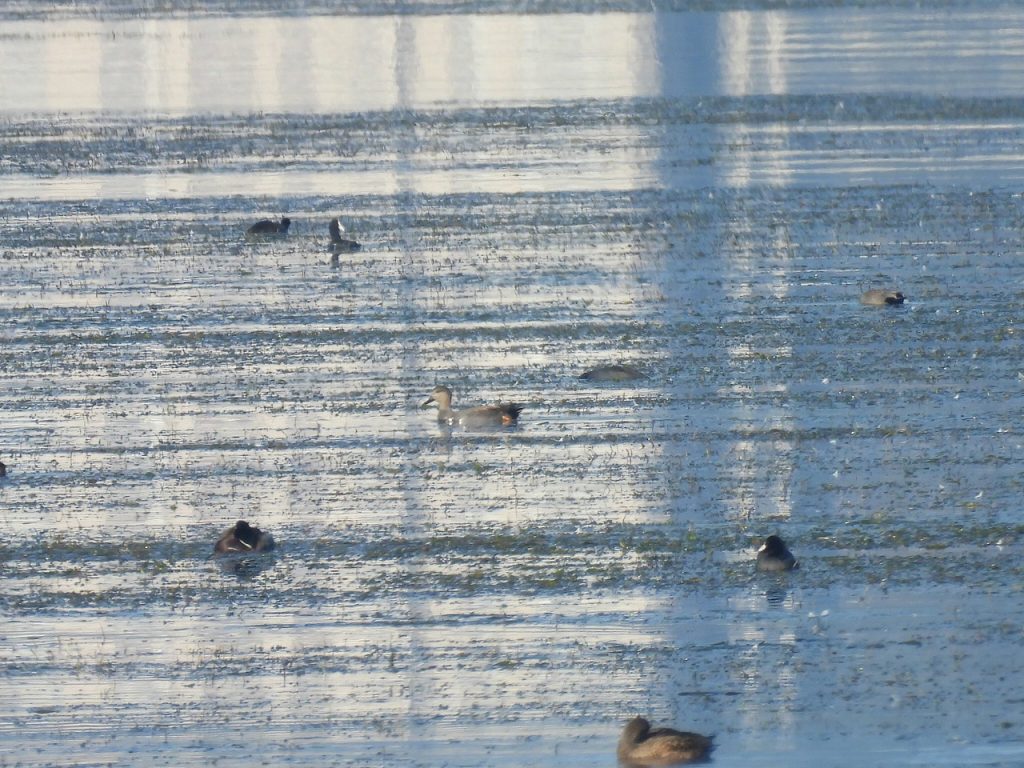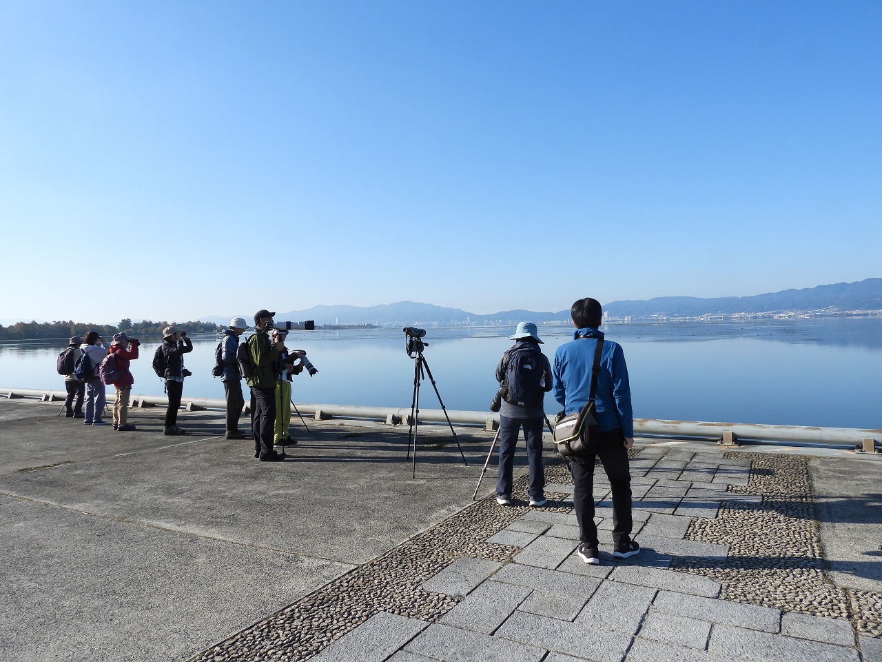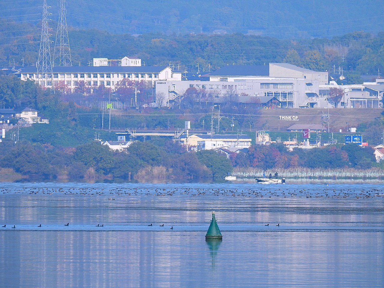 - 湖岸へ出ると、沖合にカモ類の帯が広がる
