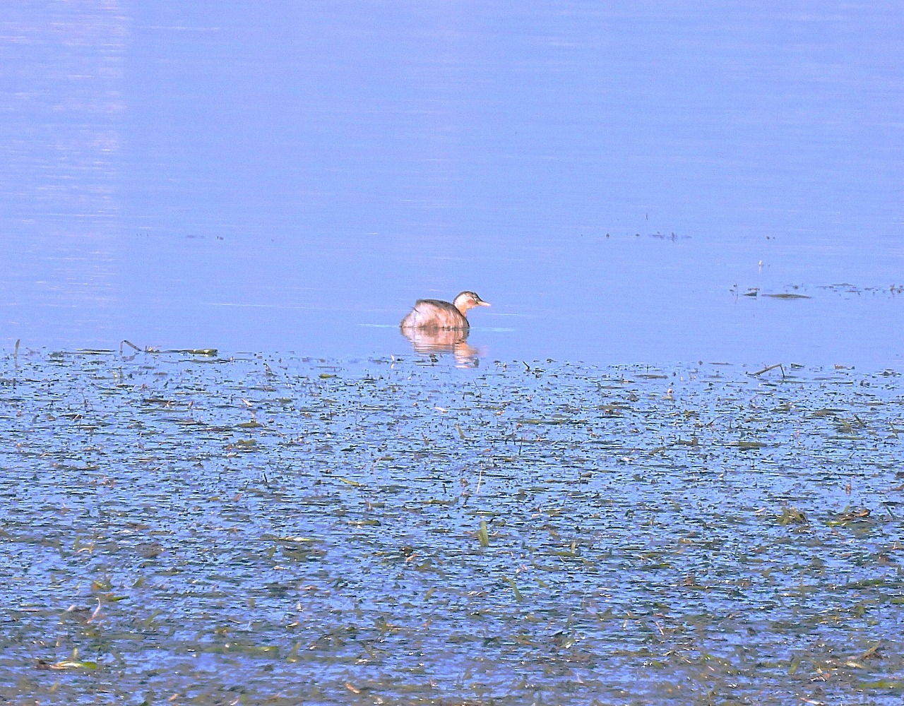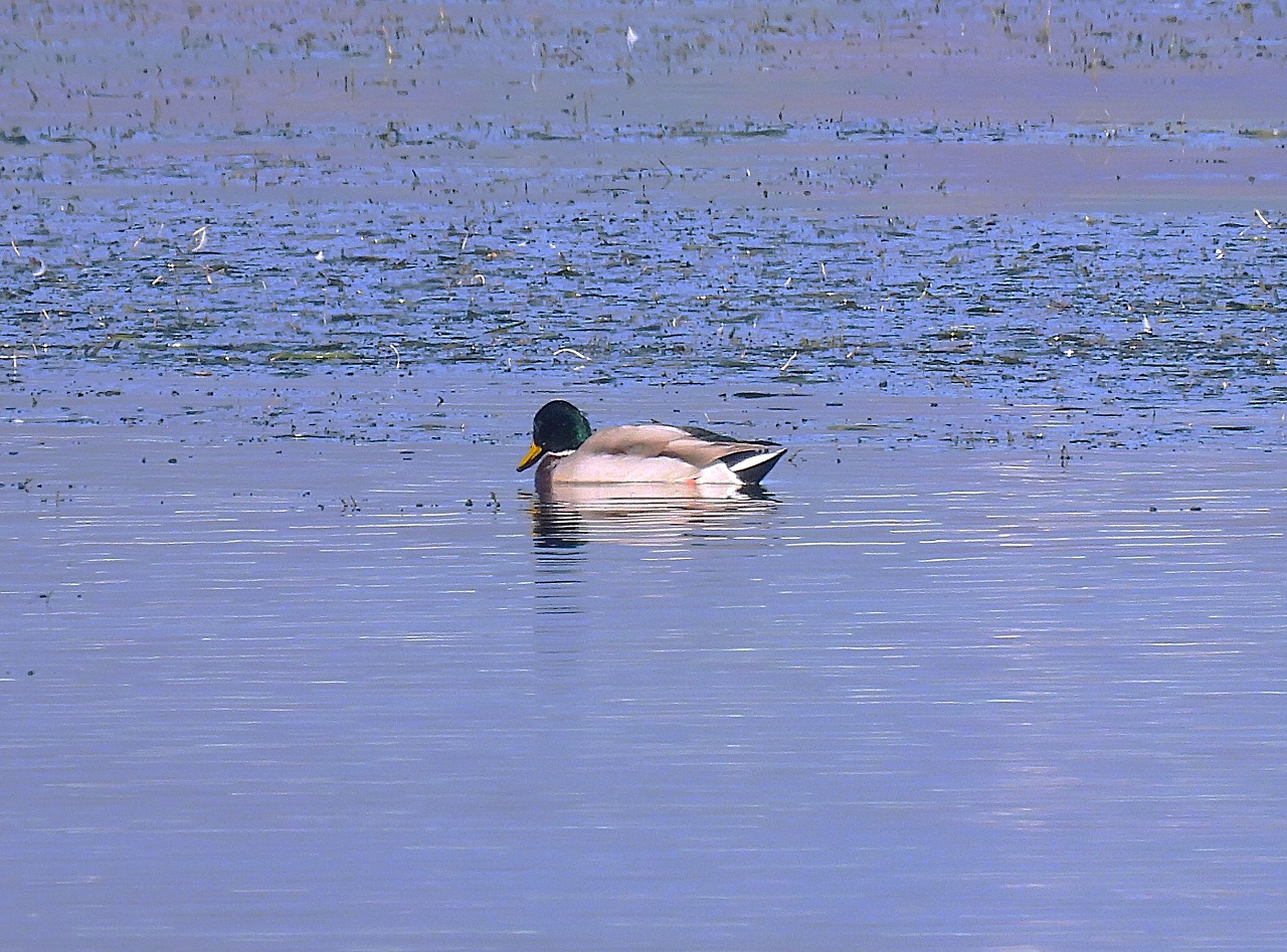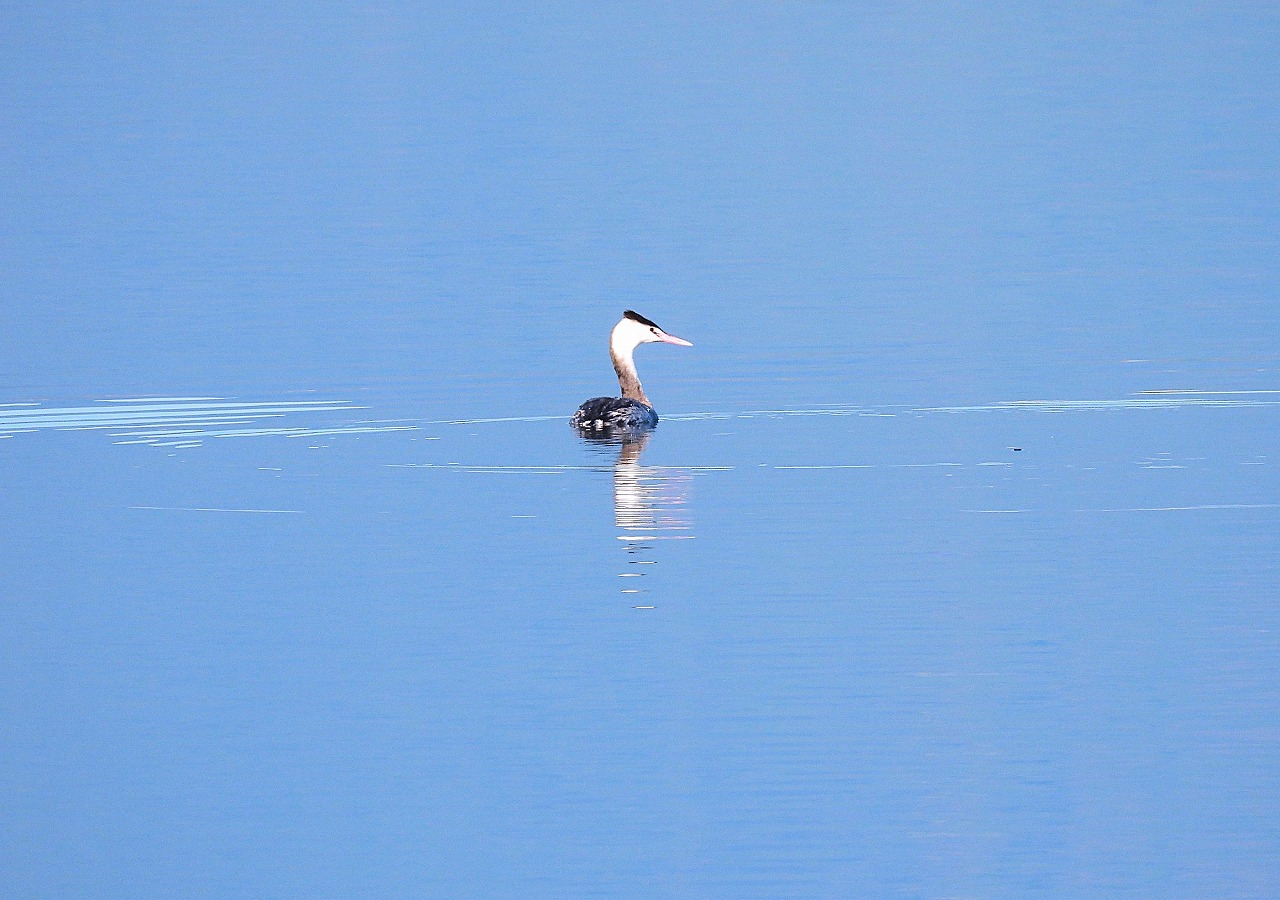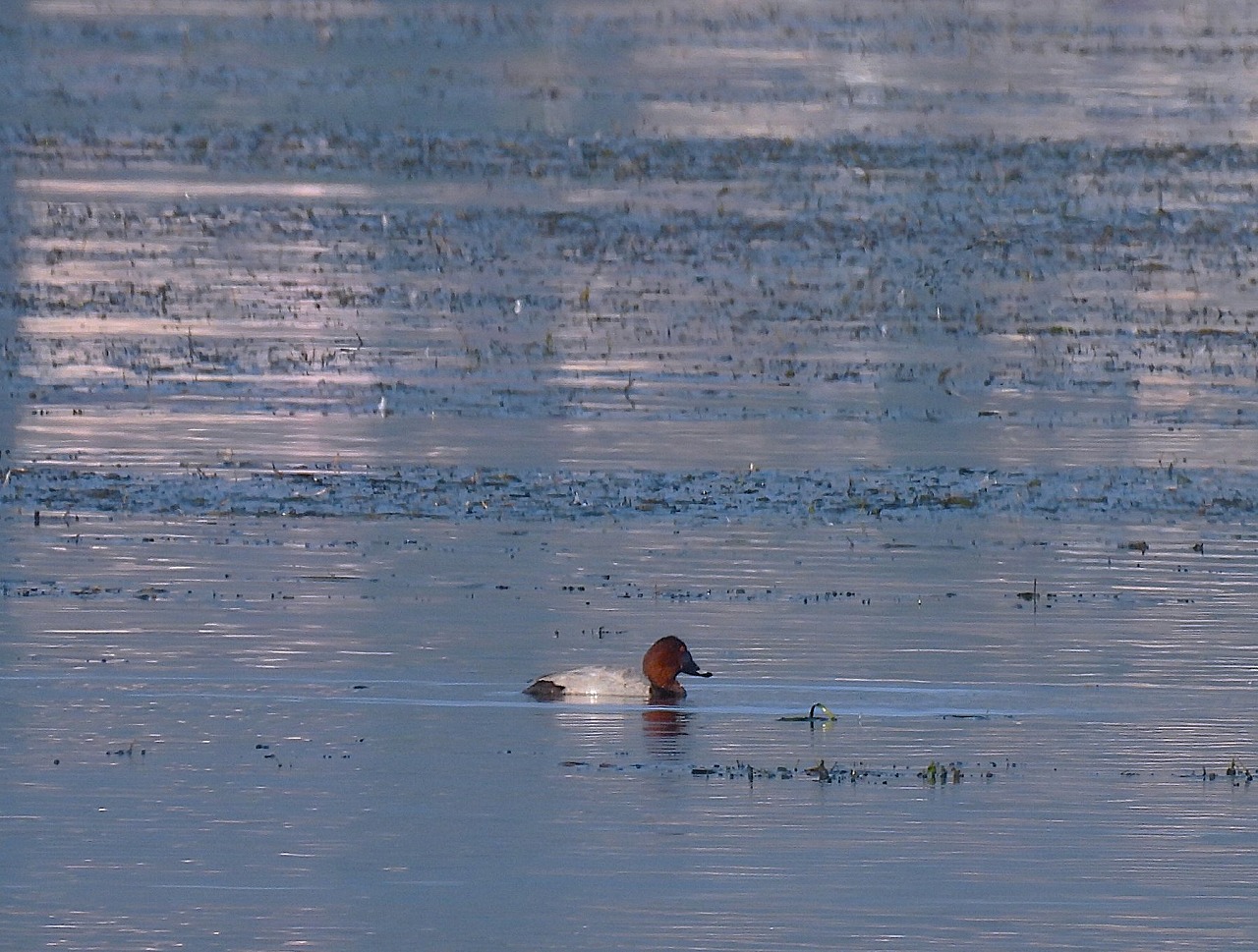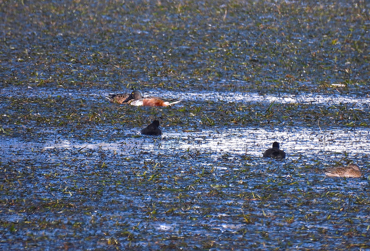 - 湖岸へ出ると、沖合にカモ類の帯が広がる