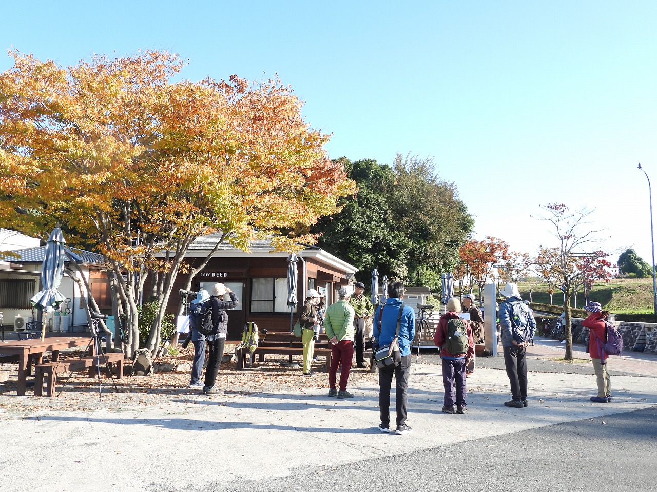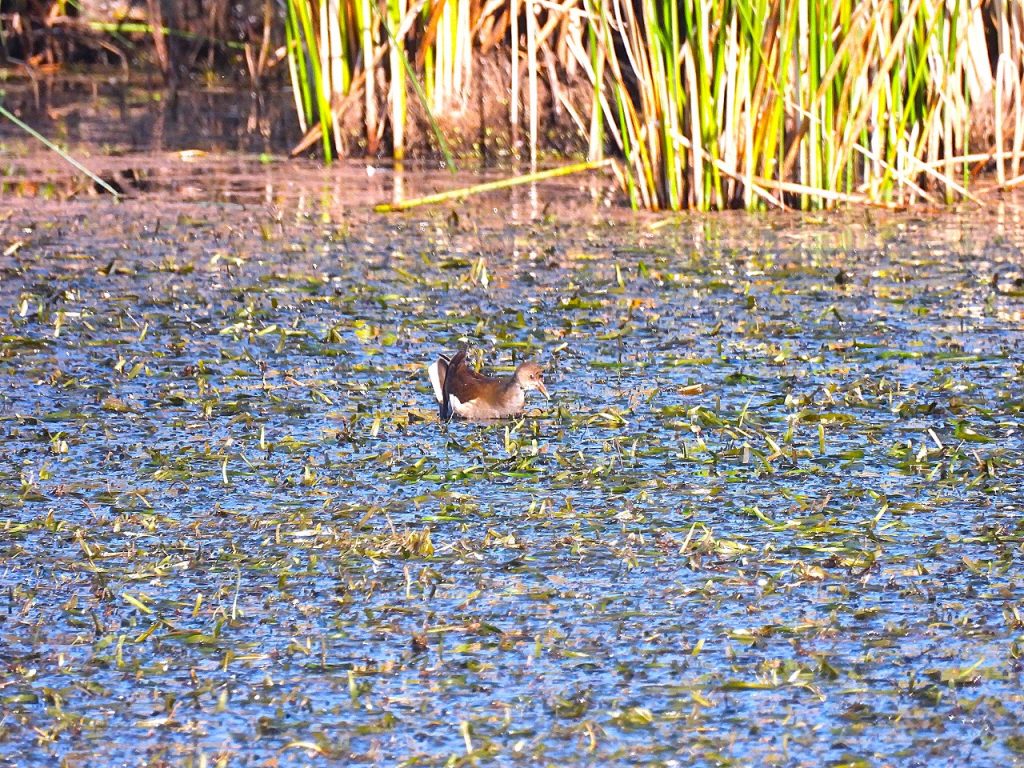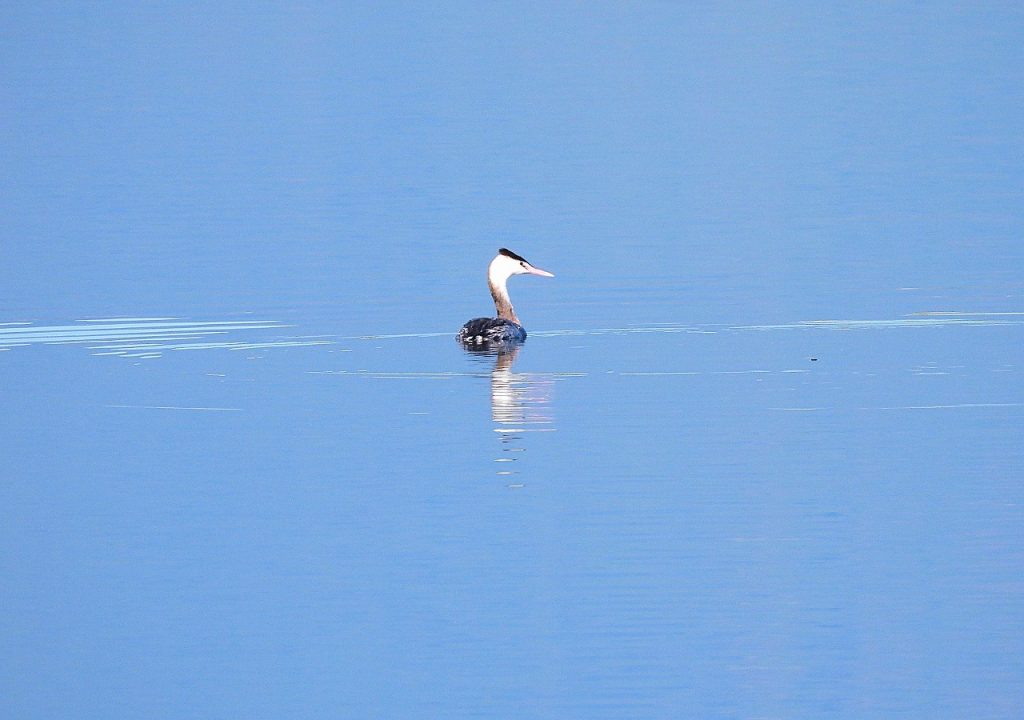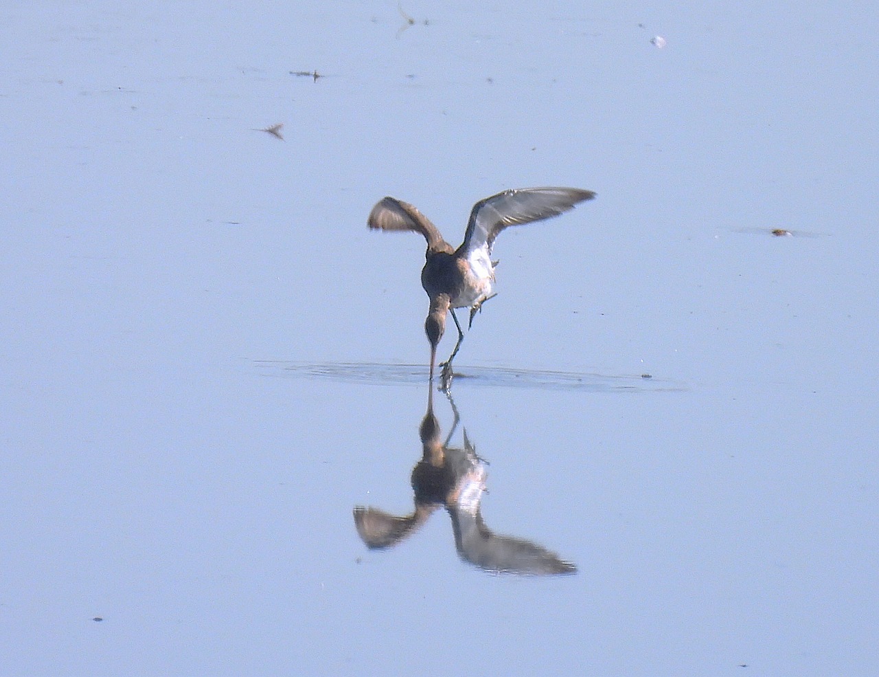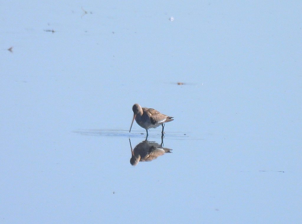 風の無い日で、琵琶湖の湖面は波も立たず平坦で、烏丸半島の湖岸からスコープで眺めると、はるか沖合いの方まで湖面にカモやオオバンなどおびただしい数の水鳥の群れが延々と連なって活動している様子が認められました。先月に続き、まだ湖面にはたくさんの水草が浮いており、それらを盛んに食べているようです。琵琶湖の水位が-56㎝まで下がっているため赤野井湾の奥には干潟や浅瀬が広がっており、オグロシギ4羽が水の中を歩きながら長い嘴を泥の中に差し込んで餌を探していました。