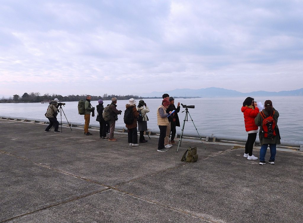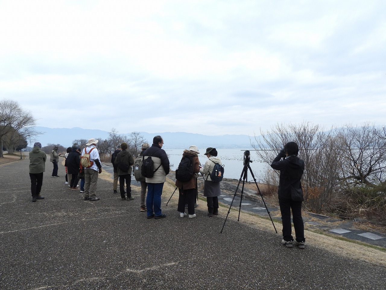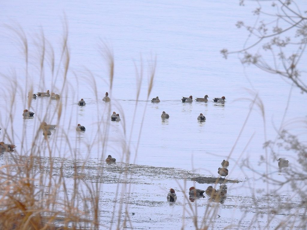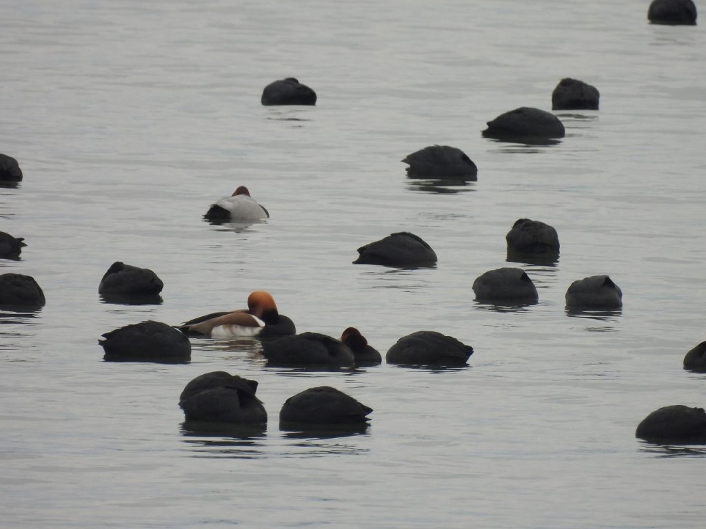 烏丸半島の岸壁から眺めた琵琶湖のオオバンやマガモ、ヒドリガモ、ミコアイサなど水鳥の多くは沖の方で食事中の様子。岸近くには湖岸の芝生に上陸しようとするヒドリガモやオオバンが集まっていました。赤野井湾では先月と同様、黒白の碁石のようにオオバンやホシハジロなど。紅一点もまだ見られました。