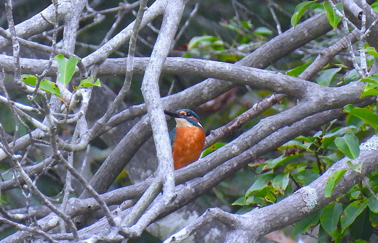 朝からどんより曇り空、でも終了までほとんど時雨れることなく終われました。山上ダムは年に一度の護岸修復のため水位が下がっていましたが、カルガモ、カイツブリは健在。開始前にセグロセキレイに追われカワセミも登場!