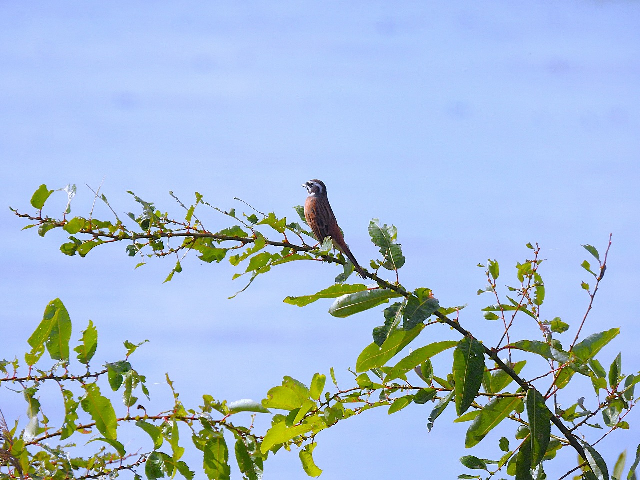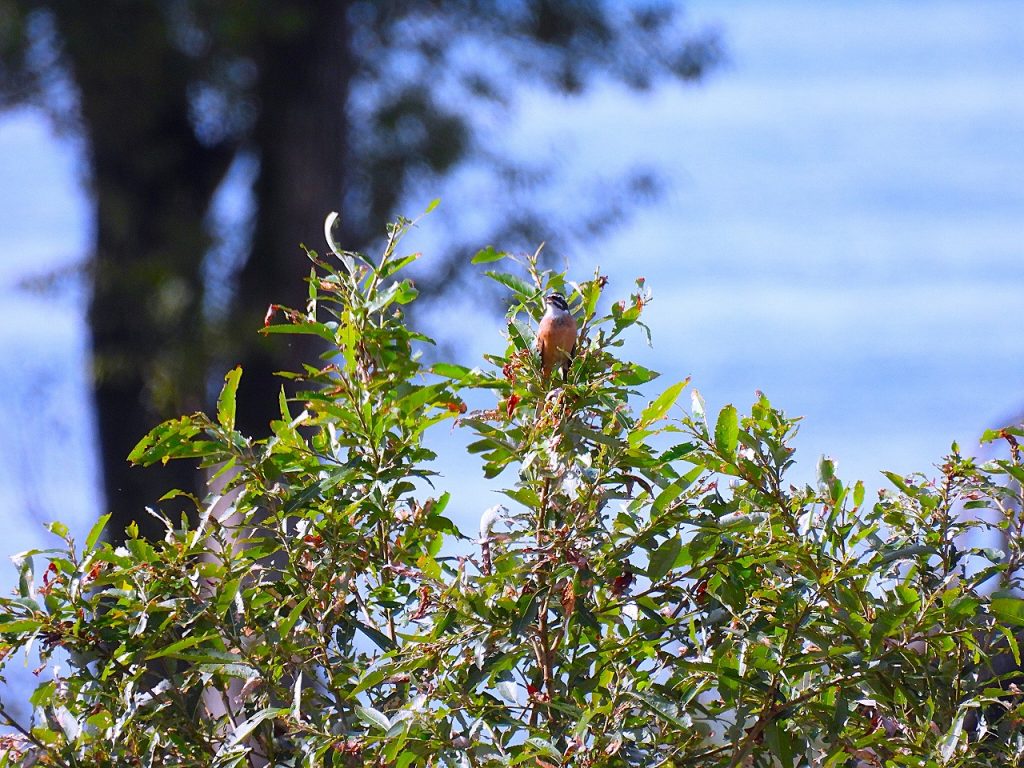 - 湖岸の低木で囀るホオジロ♂