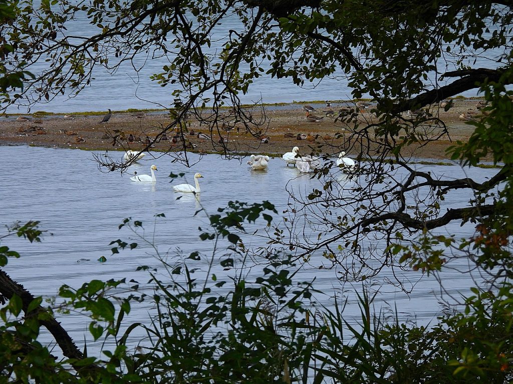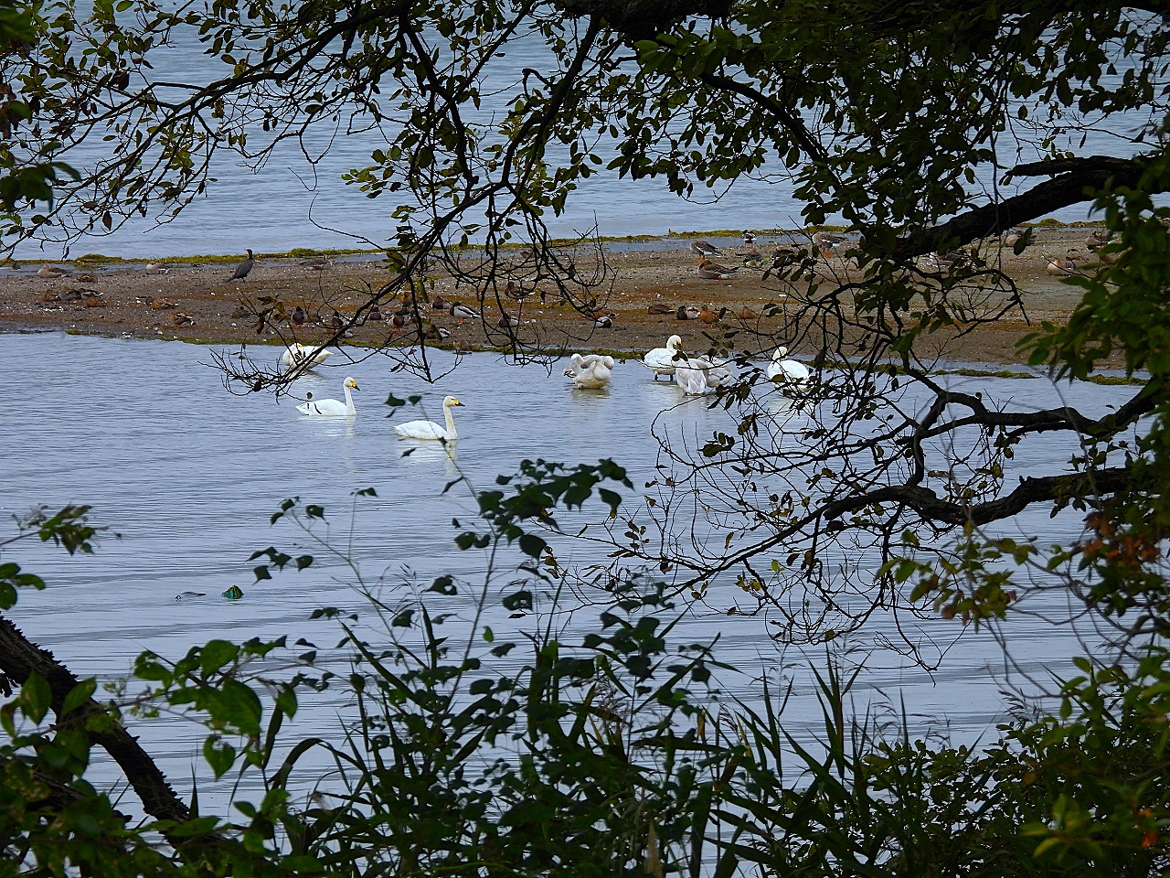 - 湖岸の木立の隙間からコハクチョウ
