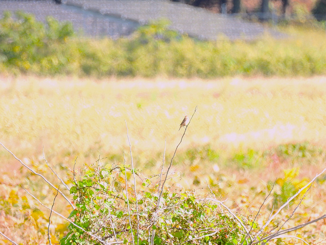冬の小鳥も多く各所でジョウビタキの声が聞こえたほか、アオジもあらゆる草藪で鳴いていました。ソバ畑では何とか残ってくれていたノビタキ、そしてこの時期しか見られないニュウナイスズメの群れも観察することができ、湖北のシーズンの始まりを感じることができました。