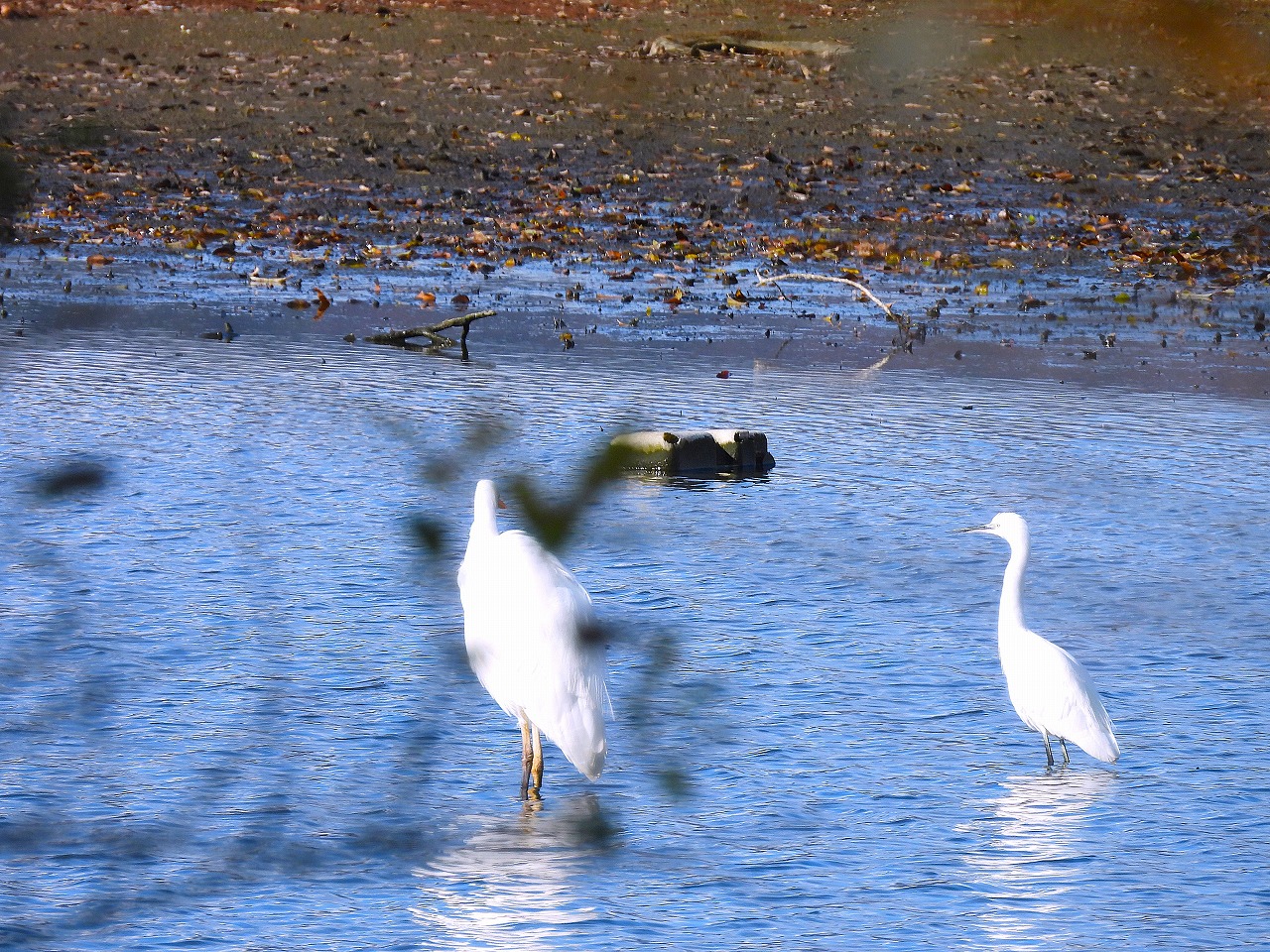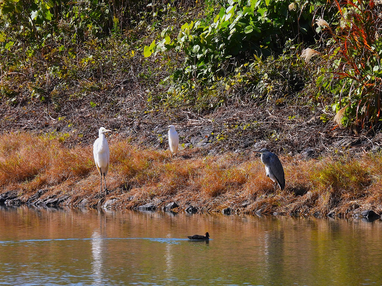 - 野田沼の島にダイサギ、コサギ、アオサギ