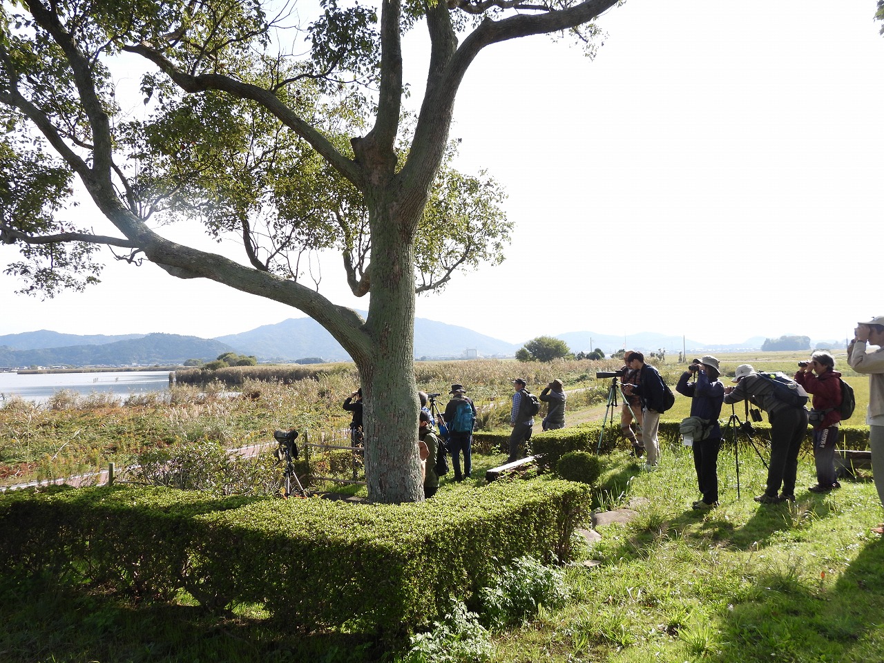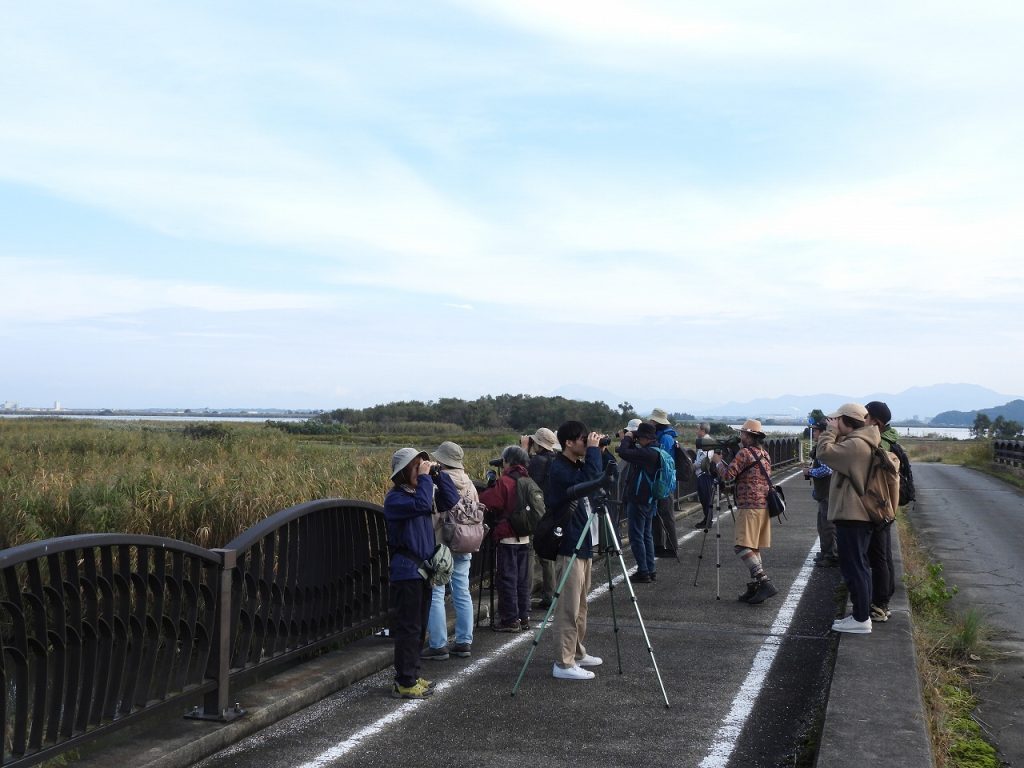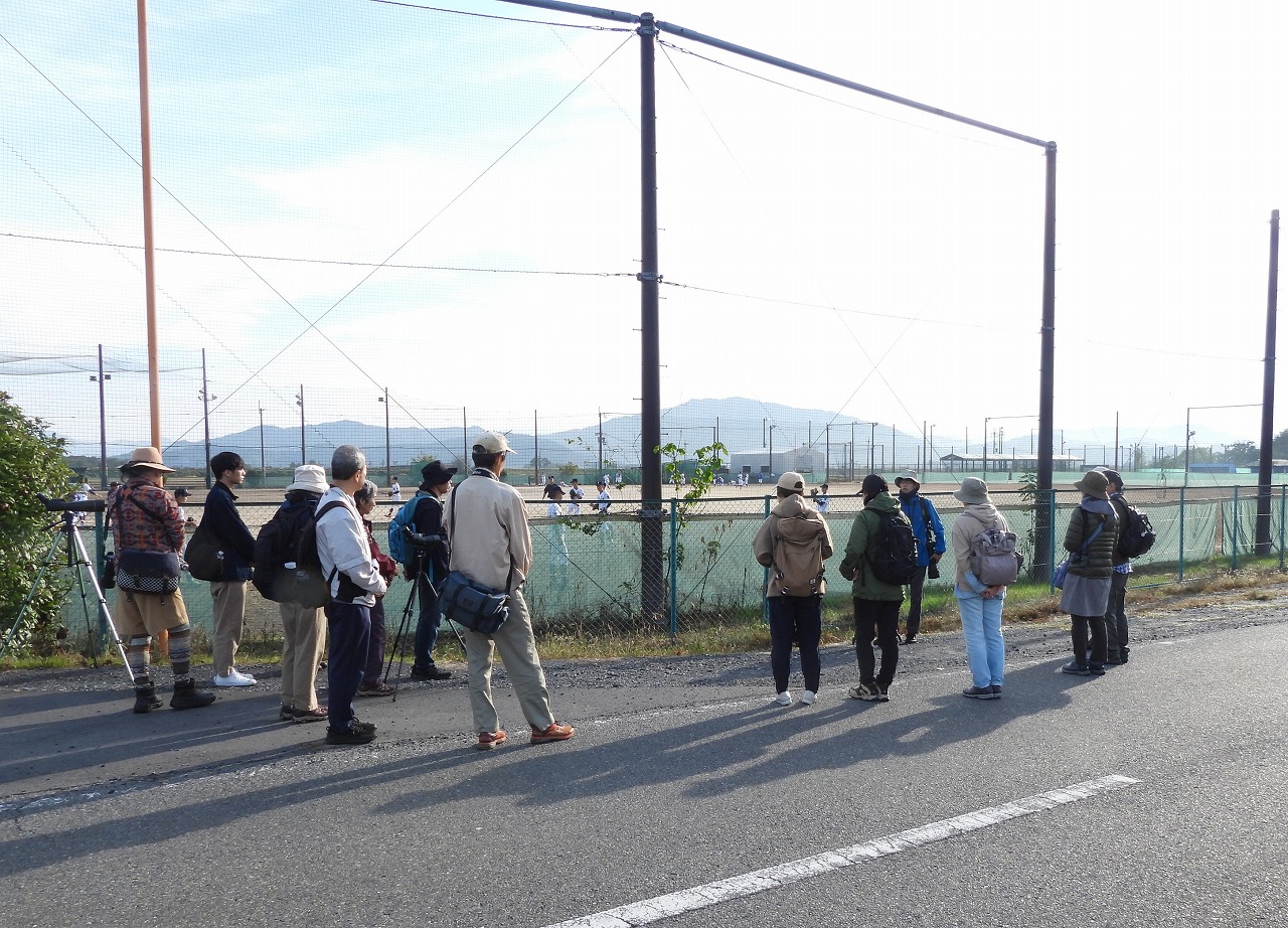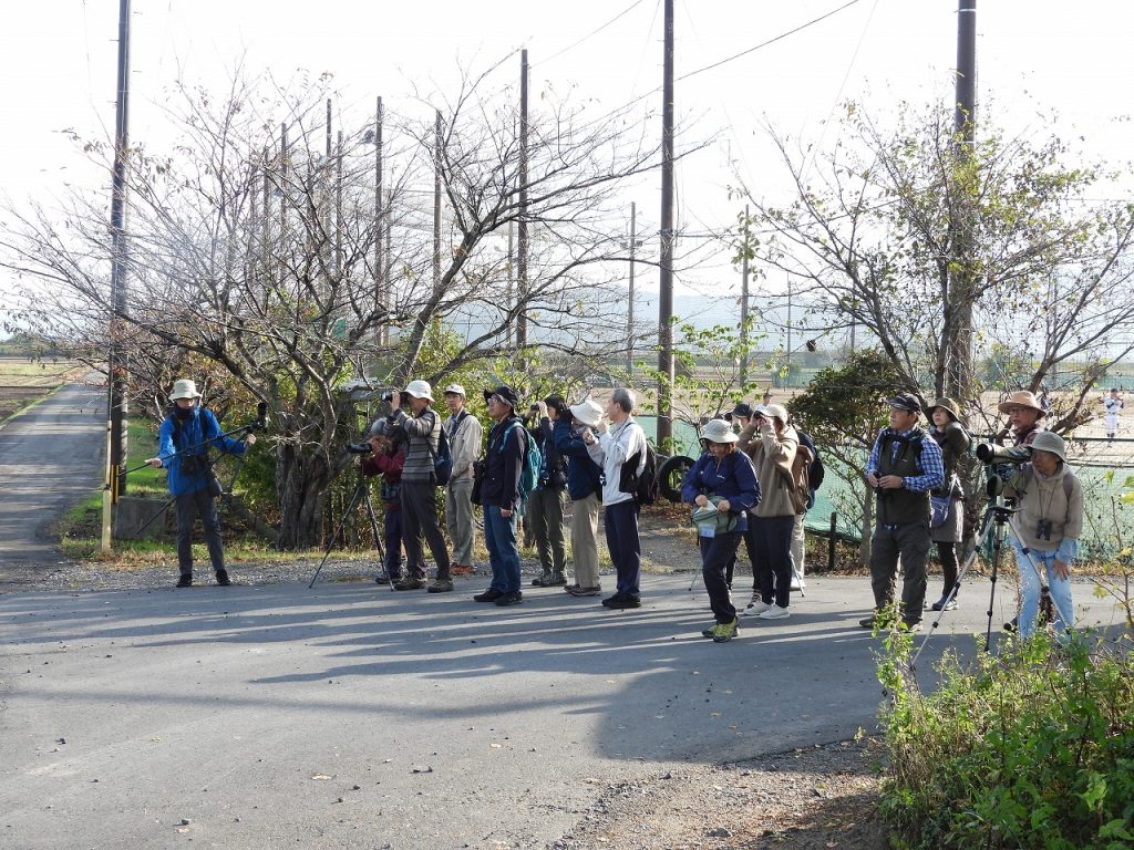 お天気に恵まれた探鳥会日和の一日でしたが、冬の水鳥・猛禽類はまだあまり渡来しておらず、チュウヒやオオバンなどが見れずという結果でした。それでも、2羽止まりのノスリ、枝に止まるシメの群れ、囀るホオジロなどをスコープでじっくり観察できたほか、頭上へまっすぐ飛んでくるチョウゲンボウなどにも出会えました。ジョウビタキはあちこちで鳴き声が聞こえたもののなかなか姿が見れず、最後の最後にすぐ近くに止まるメスを皆で観察できたのが印象的でした。