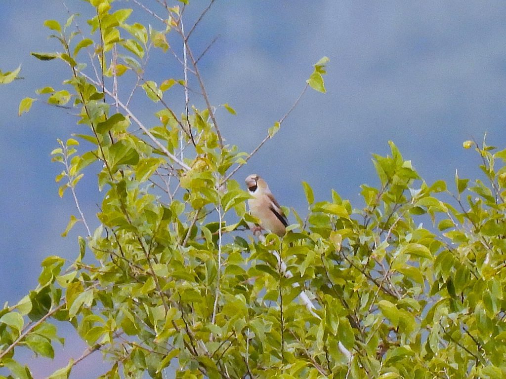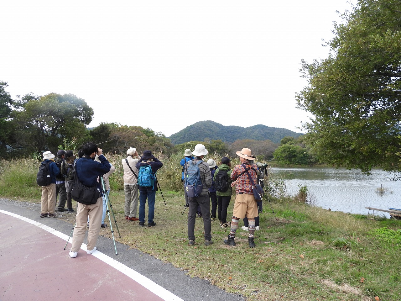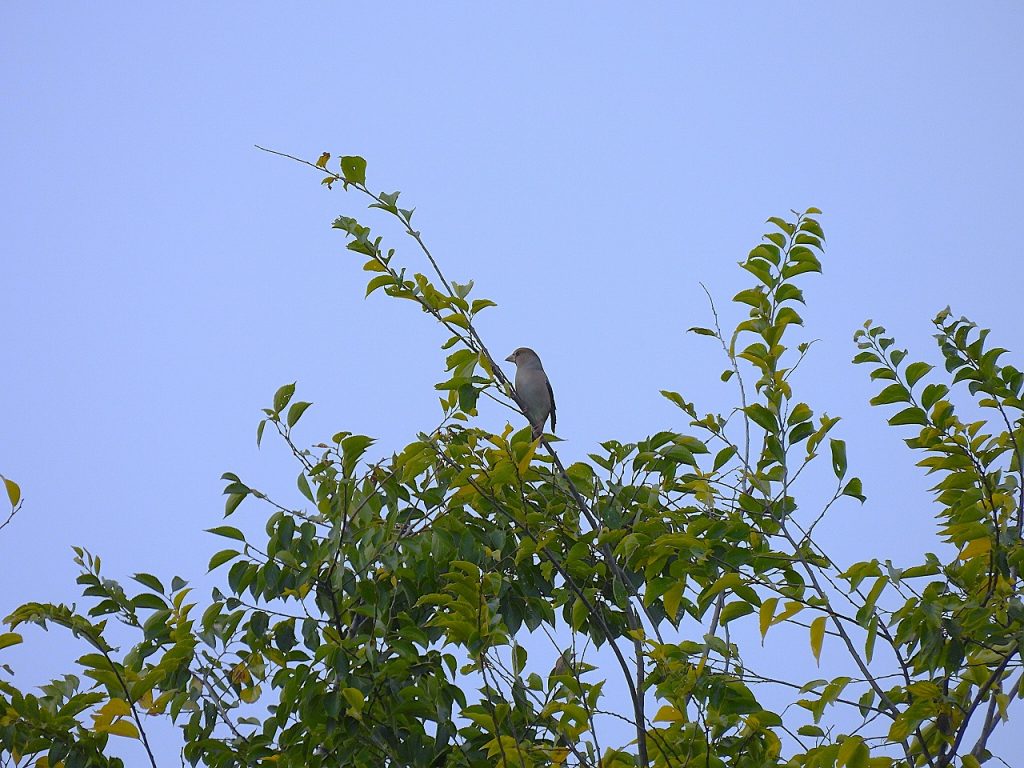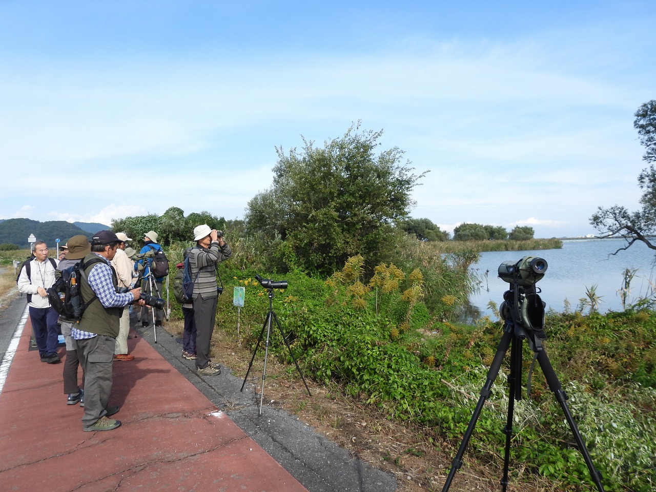 お天気に恵まれた探鳥会日和の一日でしたが、冬の水鳥・猛禽類はまだあまり渡来しておらず、チュウヒやオオバンなどが見れずという結果でした。それでも、2羽止まりのノスリ、枝に止まるシメの群れ、囀るホオジロなどをスコープでじっくり観察できたほか、頭上へまっすぐ飛んでくるチョウゲンボウなどにも出会えました。ジョウビタキはあちこちで鳴き声が聞こえたもののなかなか姿が見れず、最後の最後にすぐ近くに止まるメスを皆で観察できたのが印象的でした。