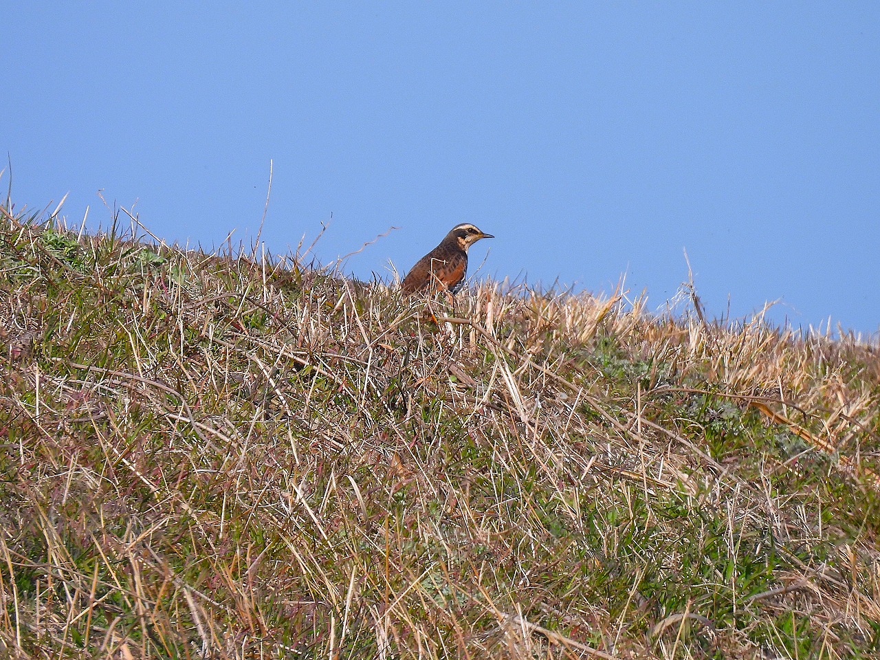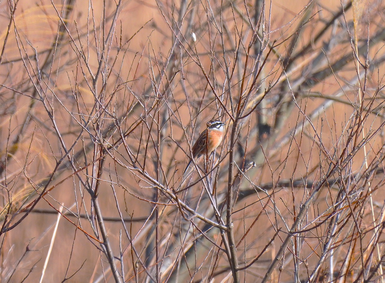 河川敷は草が刈られ、川岸の低木にホオジロ、ツグミ、モズが止まり、河川の中洲沿いにコガモ、オオバンの姿が見られました。河口では数が少なくなっていましたが、ホシハジロ、キンクロハジロ、ヒドリガモ、カンムリカイツブリの群れが、沖合いでは盛んにディスプレイするウミアイサが見られました。