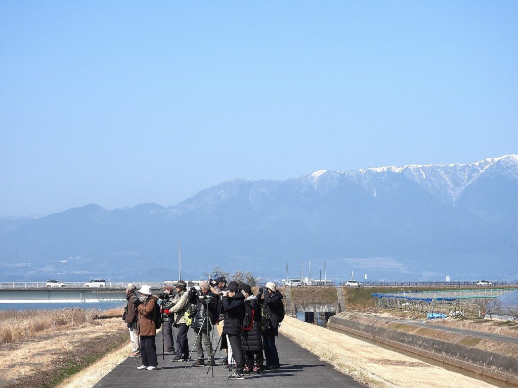 野洲大橋を渡り右岸沿いでは、河川敷でオオジュリン、ベニマシコが見られ、水路や陸地にたくさんのヒドリガモの群れが、川の中州にはアオアシシギの姿が見られました。